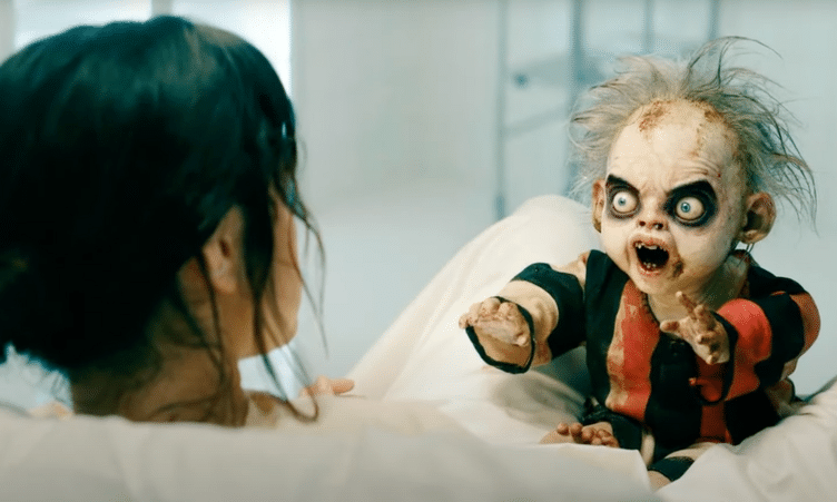 Cette créature apparaît pour la première fois lors d’une scène de “thérapie” particulièrement absurde, lors de laquelle Beetlejuice force Lydia (Winona Ryder) à accoucher d’un bébé démon. Le nourrisson revient ensuite dans un rêve de Lydia, dans lequel Astrid (Jenna Ortega) donne à son tour naissance à cette entité sortie de nos pires cauchemars. Grognements, souffles rauques, babillements inquiétants : tous ces sons proviennent directement de la bouche du réalisateur.